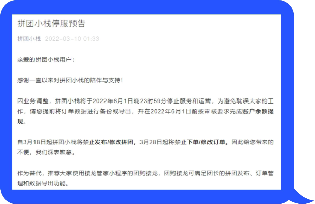 拼团小栈停服公告